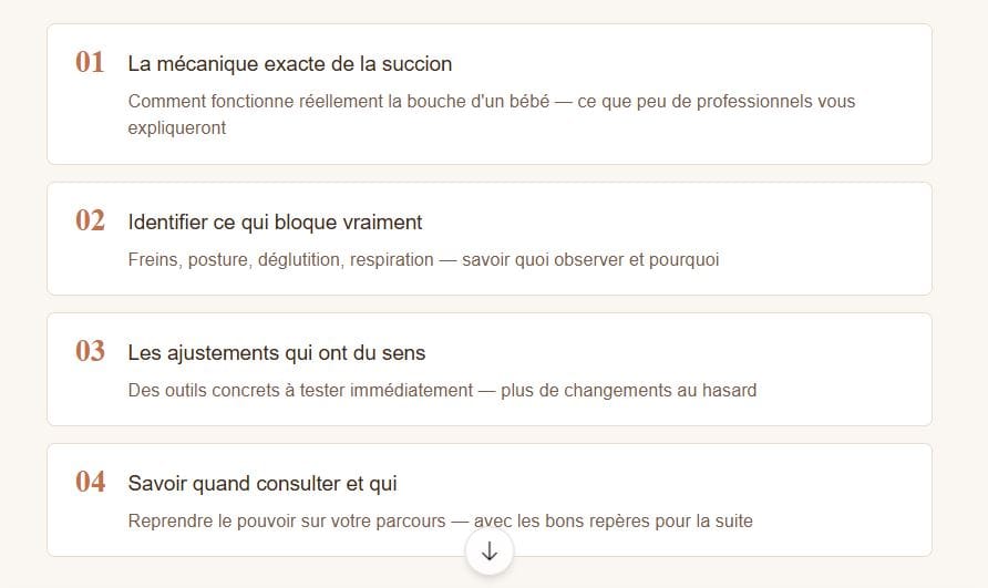J'ai accompagné plus de 5000 mères depuis 2018 et formé plus de 1000 professionnels. Ce que j'observe en consultation, c'est toujours la même chose : les mères ont consulté, elles ont essayé mais personne ne leur a expliqué comment fonctionne réellement la succion. C'est pourquoi j'ai créé cette ressource.